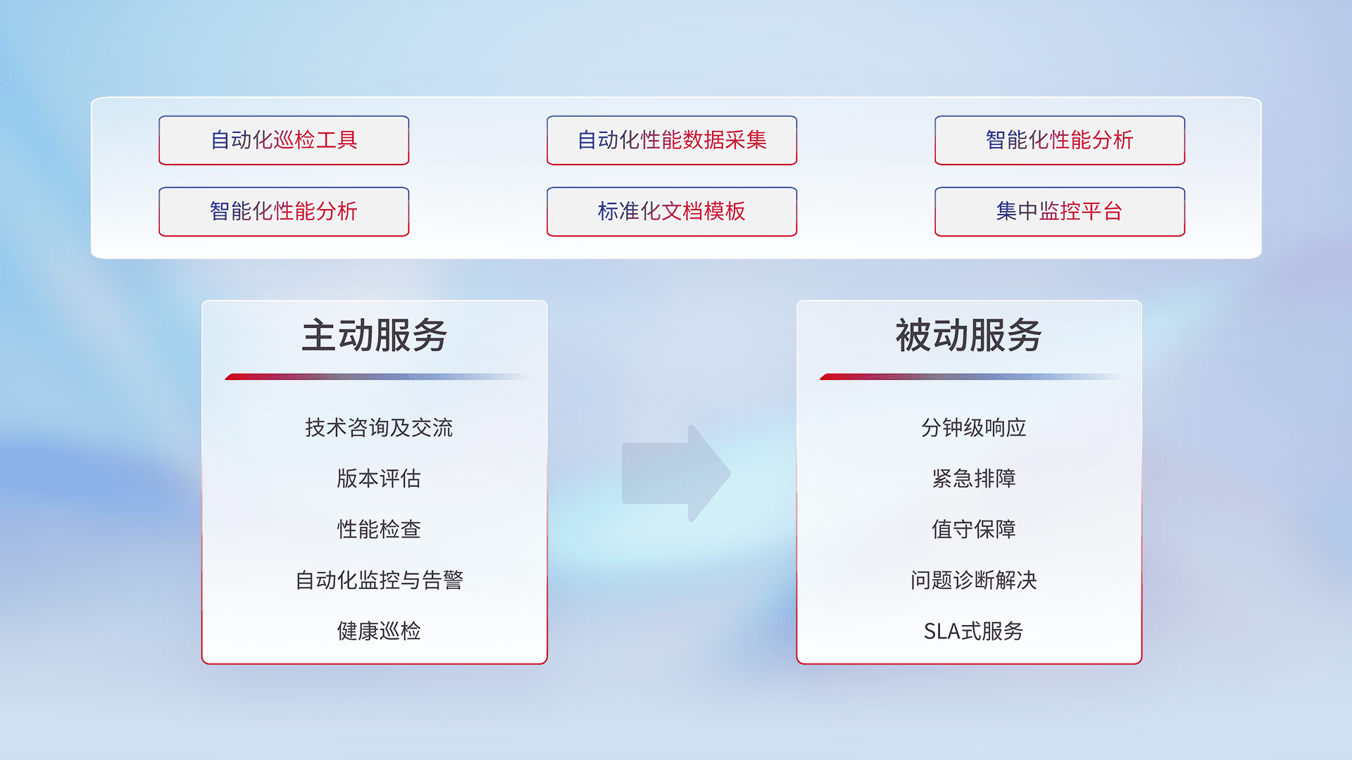 智能化工具和标准化文档,,保障服务质量,,提供主动服务(包含技术咨询、、版本评估、、性能检查、、自动化监控与告警、、健康巡检)和被动服务包含(分钟级响应、、紧急排障、、、、值守保障、、、问题诊断解决、、、SLA服务)。。
